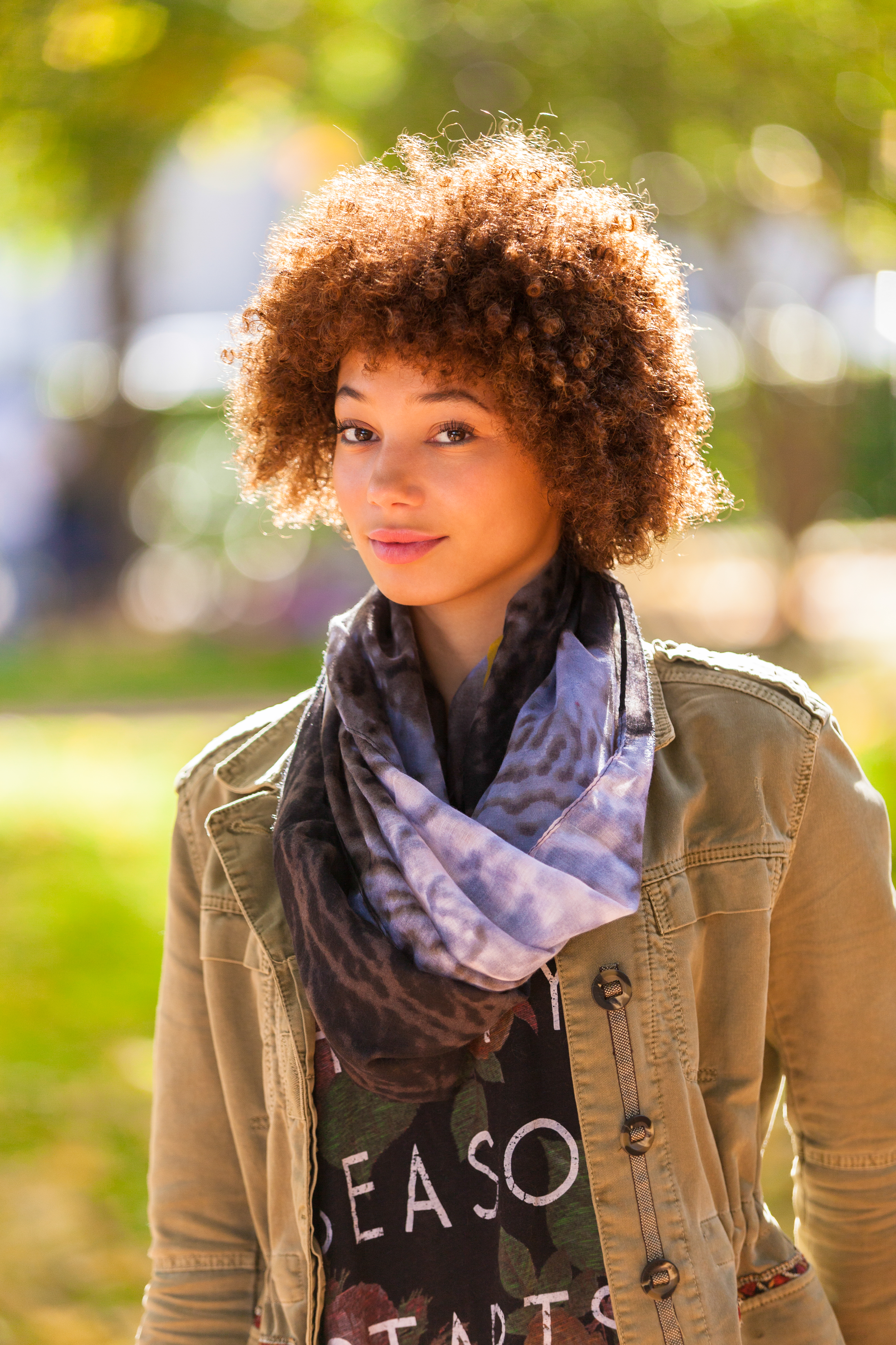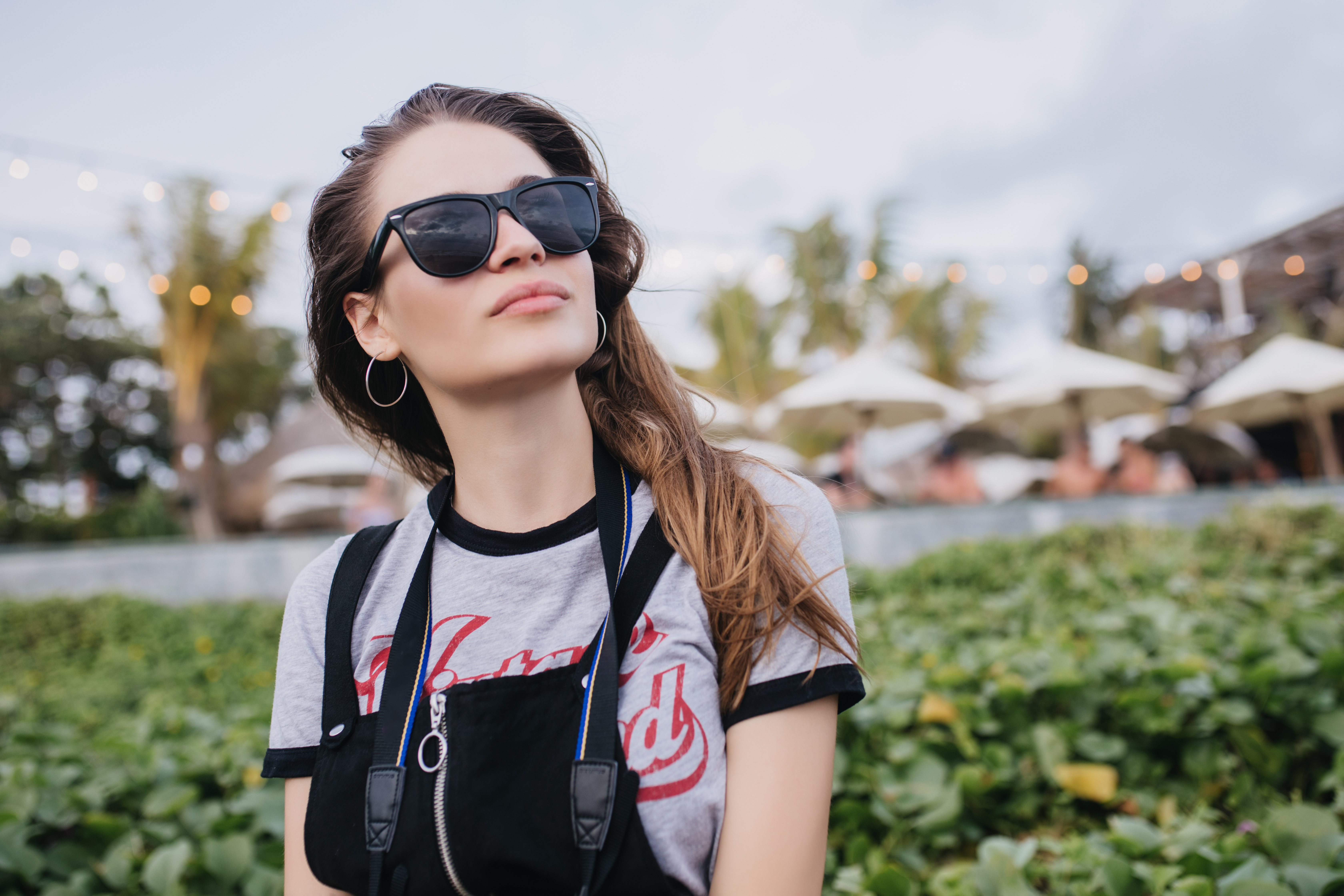 Winsome girl in black sunglasses looking at sky on nature background. Outdoor shot of fashionable brunette woman spending time outdoor in evening.download original
